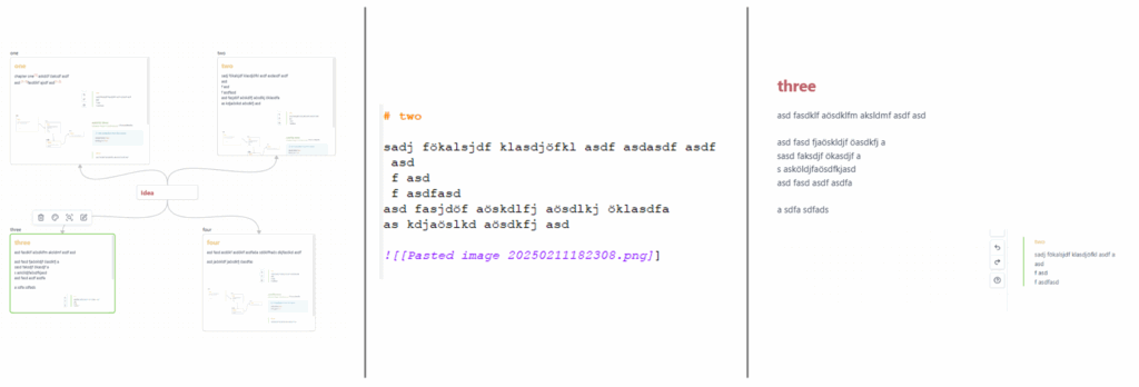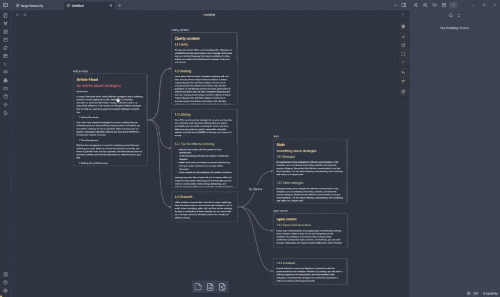 The plugin reads Obsidian’s JSON Canvas File Format and takes the elements from the canvas with their specific metadata. The metadata can then be used to navigate and arrange the elements in the document. The connections in the canvas are replicated via metadata headers containing corresponding links in the target document.